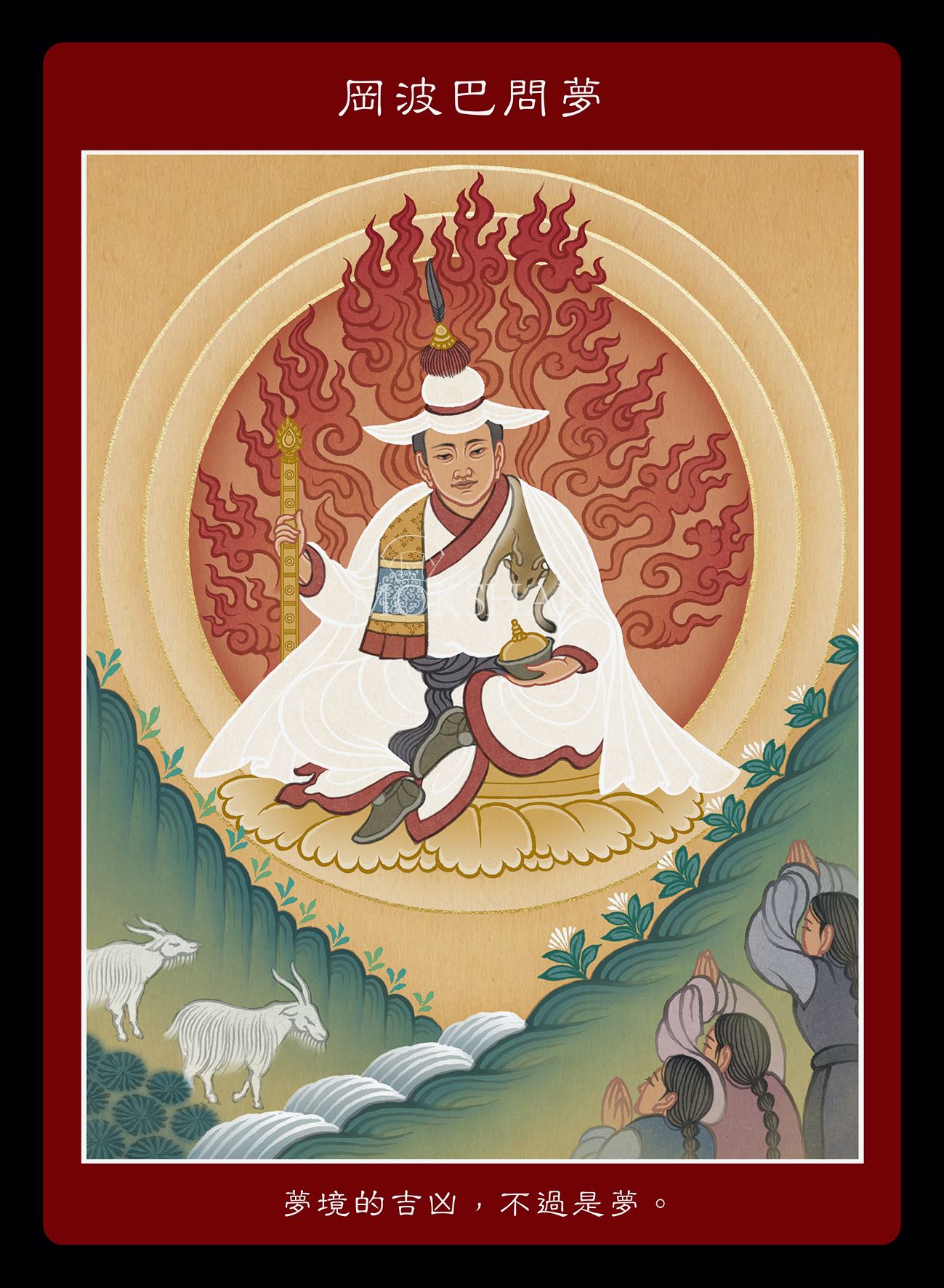 「噶舉聖誡卡」包含五十個噶舉派禪師們的重要生命場景,彰顯噶舉派以禪定證量稱道的特質。透過牌卡、大禪修者的生命故事成為我們忙碌生活中更自在、不流於煩惱與二元對立的重要指引。讓聖者們透過牌卡的方式傳達祝福,陪伴學人行者一同走向解脫。